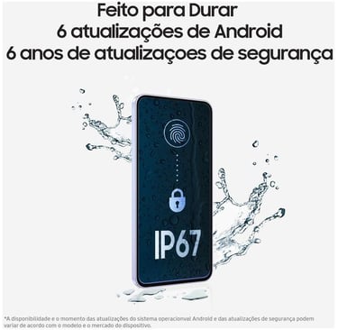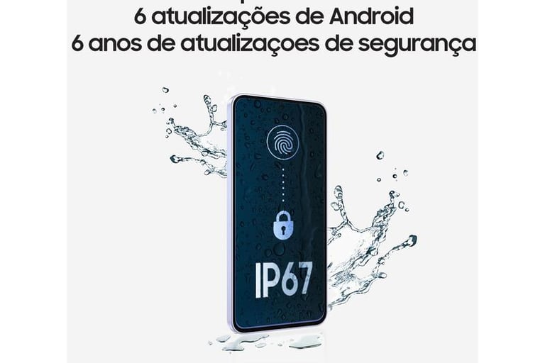 "O Galaxy A56 5G é feito para durar. Ele oferece 6 anos de atualizações de Android e segurança, além de resistência à água e poeira com certificação IP67. É o investimento inteligente para quem quer um celular moderno por muito tempo."