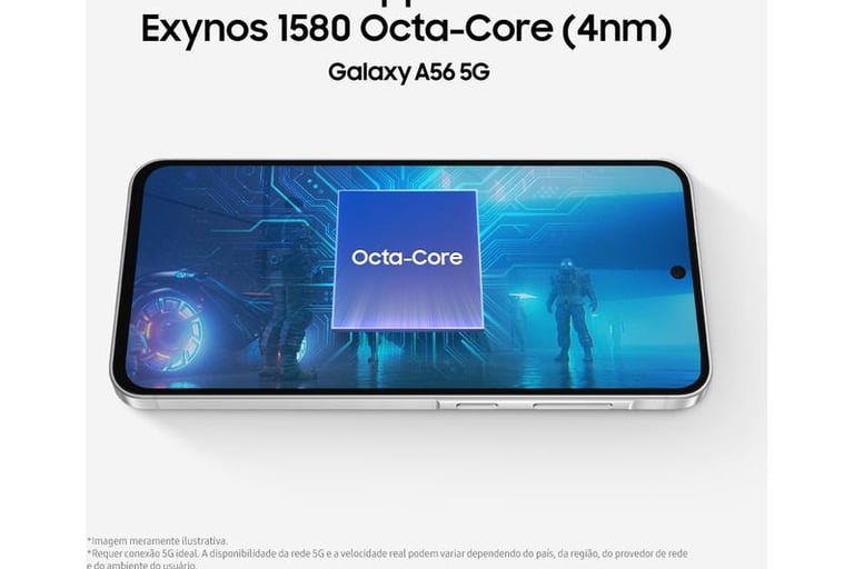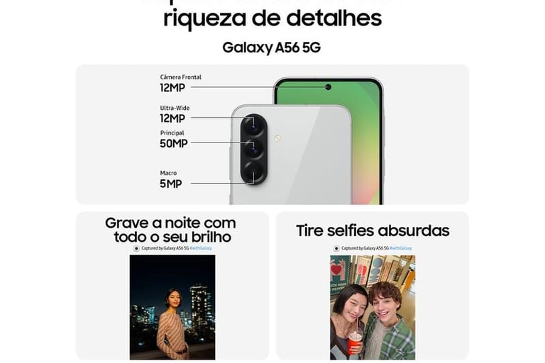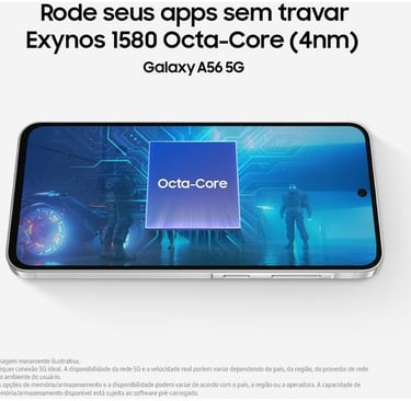 Conheça o Samsung Galaxy A56 5G: Tela Super AMOLED de 6,7", processador Exynos 1580, câmeras com IA e 6 anos de atualizações. O smartphone feito para durar.